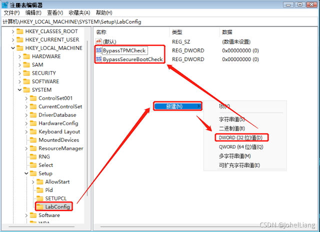 5、在项 LabConfig 下分别新建 DWORD(32位)值 BypassTPMCheck 和 DWORD(32位)值 BypassSecureBootCheck